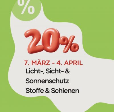 Vom 7. März bis zum 4. April 2026 schenken wir Ihnen 20 % Rabatt auf ausgewählte Licht‑, Sicht‑ und Sonnenschutzlösungen sowie auf hochwertige Stoffe und Schienen.